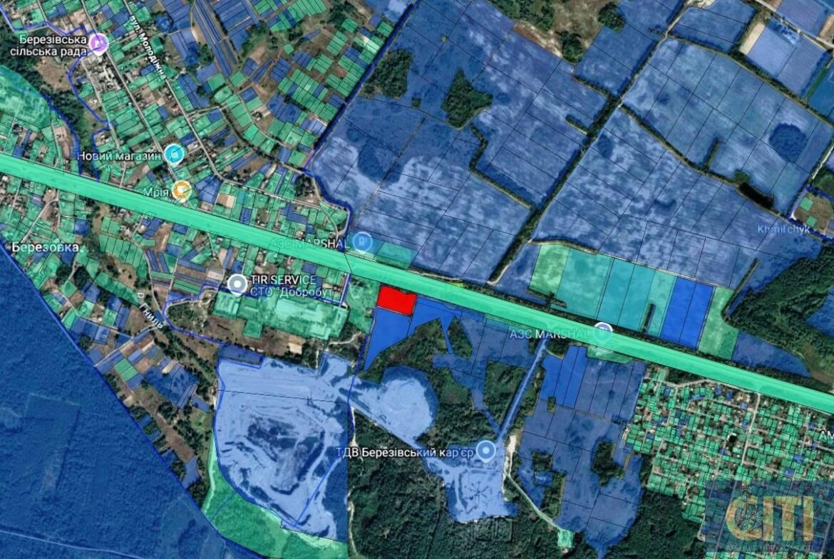 Продається земельна ділянка комерційного призначення в Житомирській області, поруч із населеним пунктом Березівка, біля траси Київ – Чоп (Е40). Площа — 0,96 га, фасадна лінія — 120 метрів. Відмінна локація з активним трафіком, поруч розташовані кафе, АЗС, транспортна розв’язка, електролінія та кар’єр.